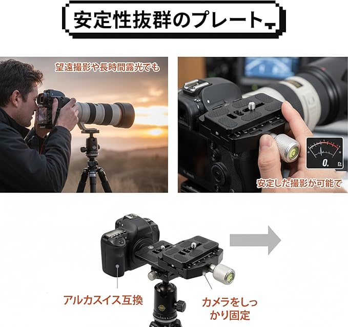 【安定性抜群のプレート】アルカスイス互換のプレートとクランプで、カメラをしっかり固定。望遠撮影や長時間露光でもブレを防ぎ、安定した撮影が可能です。