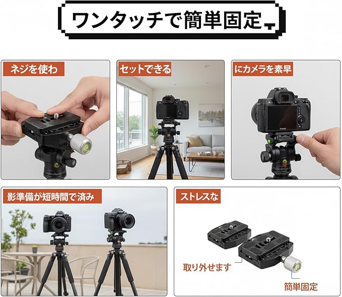 【ワンタッチで簡単固定】ネジを使わずにカメラを素早くセットできるクイックリリース仕様。撮影準備が短時間で済み、ストレスなくカメラを取り外せます。