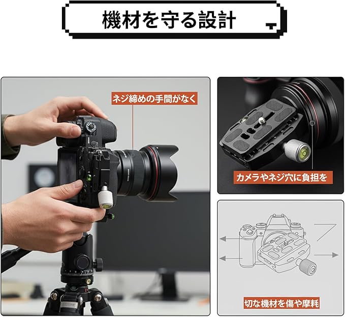【機材を守る設計】ネジ締めの手間がなく、カメラやネジ穴に負担をかけずに使用できるため、大切な機材を傷や摩耗から守ります。