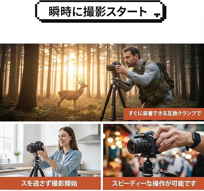 【瞬時に撮影スタート】すぐに装着できる互換クランプで、シャッターチャンスを逃さず撮影開始。スピーディーな操作が可能です。