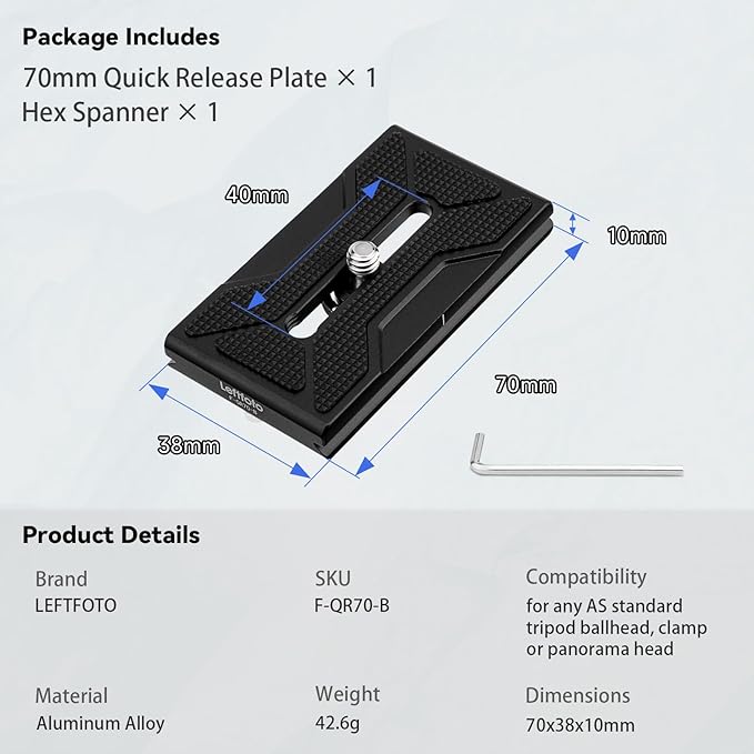 ユニバーサルクイックリリースプレートの特徴: 当社のクイックリリースプレートを使用すると、手間をかけずに完璧なショットを取得できます。RRS、ARCA-SWISS などの主要ブランドと普遍的に互換性があり、AS 規格の三脚ボールヘッド、クランプ、またはパノラマヘッドと組み合わせて使用できます。スタジオでのプロフェッショナルや屋外での撮影を楽しむ愛好家に最適です。 1/4 インチ D リングネジを使用すると、数秒で取り付けと取り外しが可能です。二重安全ストップネジが誤って落下するのを防ぎ、滑り止めゴムパッドがカメラを安定させ、傷から保護します。 高強度航空アルミニウム合金を CNC 加工で製造しているため、軽量で耐食性に優れ、長持ちします。熱帯雨林でもビーチでもどこにでも持ち運べ、いつも安定した性能を発揮します。 仕様: ブランド:LEFTFOTO 素材:金属合金 色:艶消し黒 サイズ:2.7 1.6 0.4 インチ(70 39.4 10mm) 重量:0.1 ポンド(45g) 取り付けネジ径:1/4 インチ(クイックリリースプレートとカメラを接続するネジサイズ) パッケージ内容:1 個の 70mm クイックリリースプレート