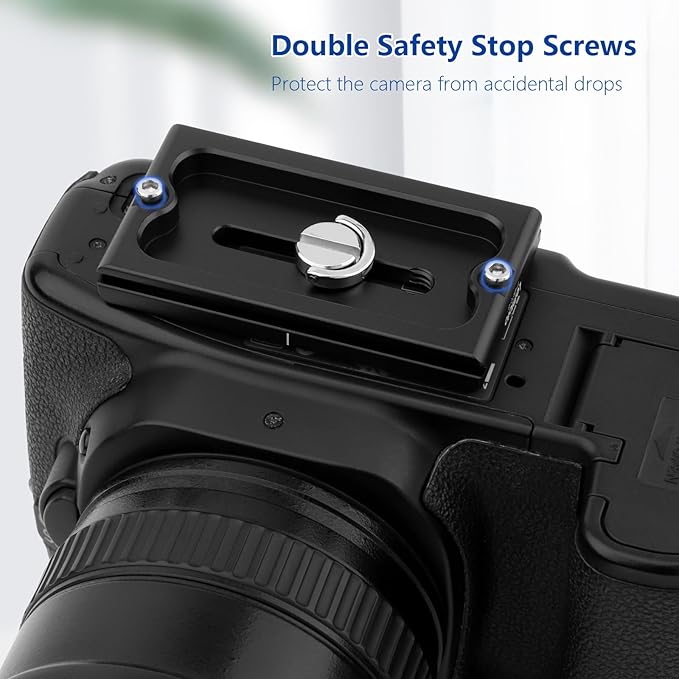 【二重安全システム】2 つのストップネジが誤って落下するのを防ぎ、撮影中のカメラを確実に固定します。